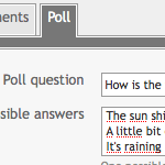 Wenn du einen Umfragebutton beim Verfassen eines Textes siehst, kannst du diesem Text eine Umfrage hinzufügen. Formuliere eine Frage und schreibe die Antwortmöglichkeiten in das Textfeld. Du kannst auch angeben, wie lange eine Umfrage gültig ist. Du kannst mehrfache Antworten zulassen und zusätzlich einstellen, ob eine Stimme nachträglich geändert werden darf und ob die Ergebnisse nach Stimmen sortiert werden sollen. Bedenkes, dass bei Mehrfachumfragen die Gesamt-Prozentzahl den Wert 100 weit überschreiten kann!